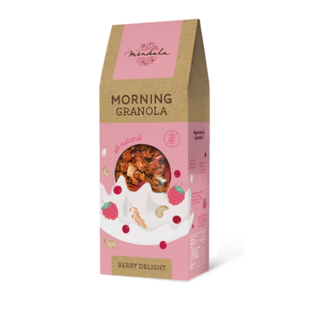 Made with gluten-free oats, freeze-dried raspberries, cranberries, and roasted cashews, Mendula Berry Delight Granola is a wholesome and naturally sweet blend. Lightly baked with apple concentrate, date syrup, and coconut oil, it’s vegan, gluten- and lactose-free, and contains no preservatives or additives.