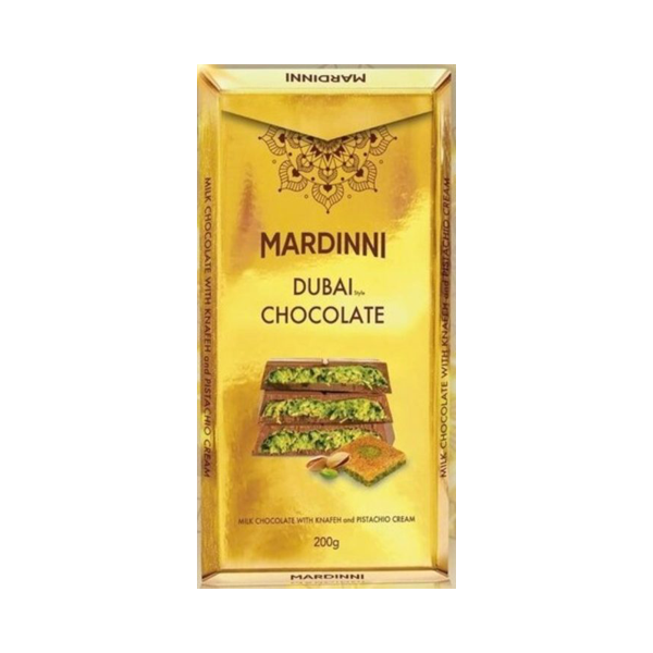Mardinni Dubai Chocolate is a premium blend of milk and white chocolate, enriched with pistachios, kadayif pastry, and tahini – a true taste of the Middle East.
