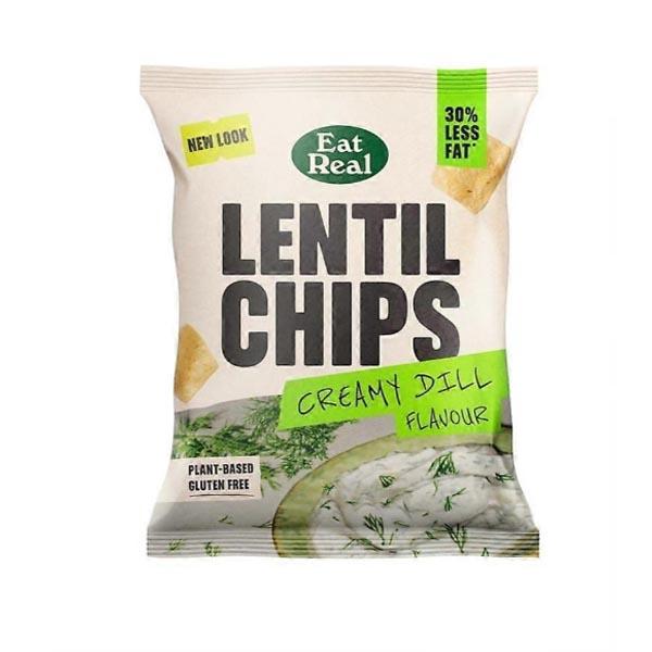 Eat Real Lentil Chips – Creamy Dill Flavour combine the earthy taste of lentils with the fresh aroma of dill and a creamy, balanced seasoning. This light, crispy snack is gluten-free, vegan, and contains 30% less fat than regular potato chips.