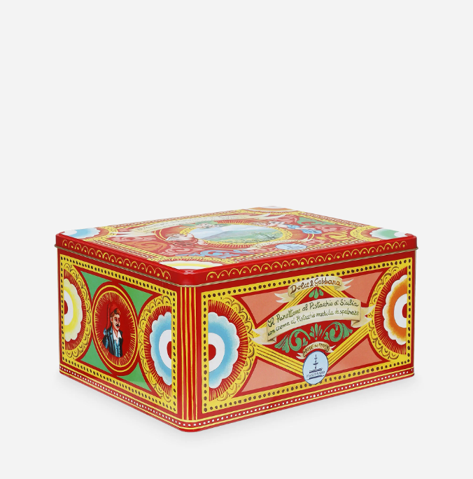 Fiasconaro Panettone with Sicilian pistachio is a true masterpiece, which comes in a uniquely designed metal box by Dolce & Gabbana, so that it radiates elegance and sophistication in every small detail. This unique panettone is made with a light, airy dough coated with white chocolate and whole, crunchy Sicilian pistachio pieces for a harmonious taste experience. The package also includes a bottle of soft pistachio cream and an elegant spreader knife to make the sweet experience even more complete. This rich and unique cake perfectly combines the world of traditional Milanese panettone with the flavors of southern Italy, and is also a perfect choice as a special gift, as each piece is a colorful surprise on the festive table. The metal box is available in various designs, but cannot be selected in advance.