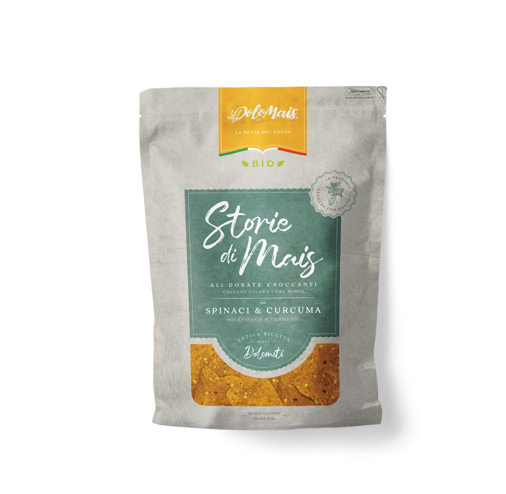 DoloMais Spinach & Turmeric Corn Chips are made with wholegrain corn flour, organic spinach, and turmeric. A light, nourishing, and crispy snack infused with natural flavors.