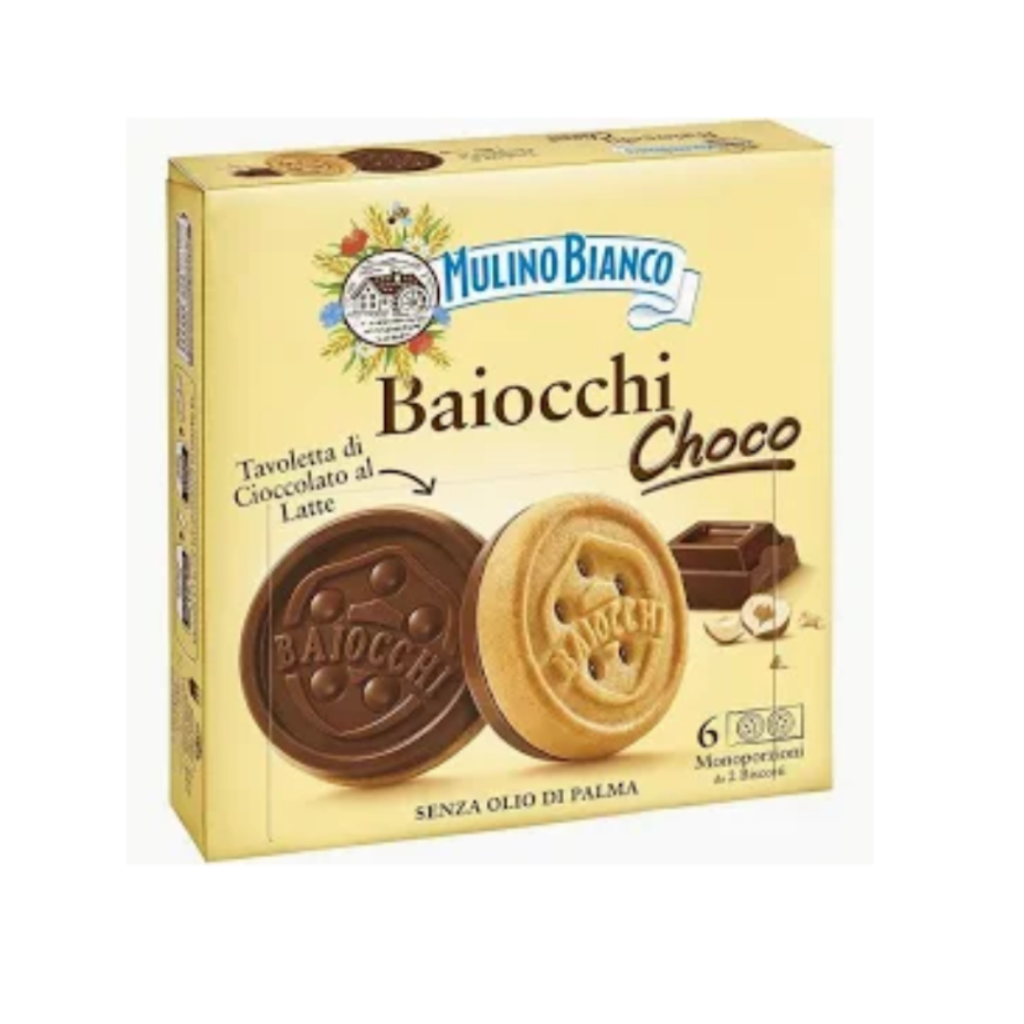 A Mulino Bianco Baiocchi csokoládés-mogyorókrémes keksz az olasz édességek egyik ikonja: két aranyszínű, omlós kekszréteg között selymesen lágy, gazdag csokoládés mogyorókrém lapul. A krém kakaóval és 100%-ban olasz mogyoróval készül, természetes alapanyagokból, tartósítószerek, mesterséges színezékek és hidrogénezett zsírok nélkül.