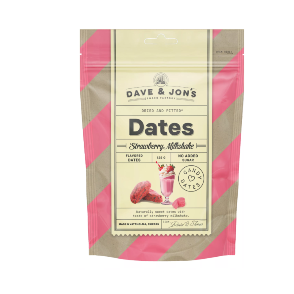 A D&J epres shake ízű datolyás snack természetes, gyümölcsösen édes finomság Svédországból – finomított cukor, pálmaolaj és mesterséges adalékok nélkül.