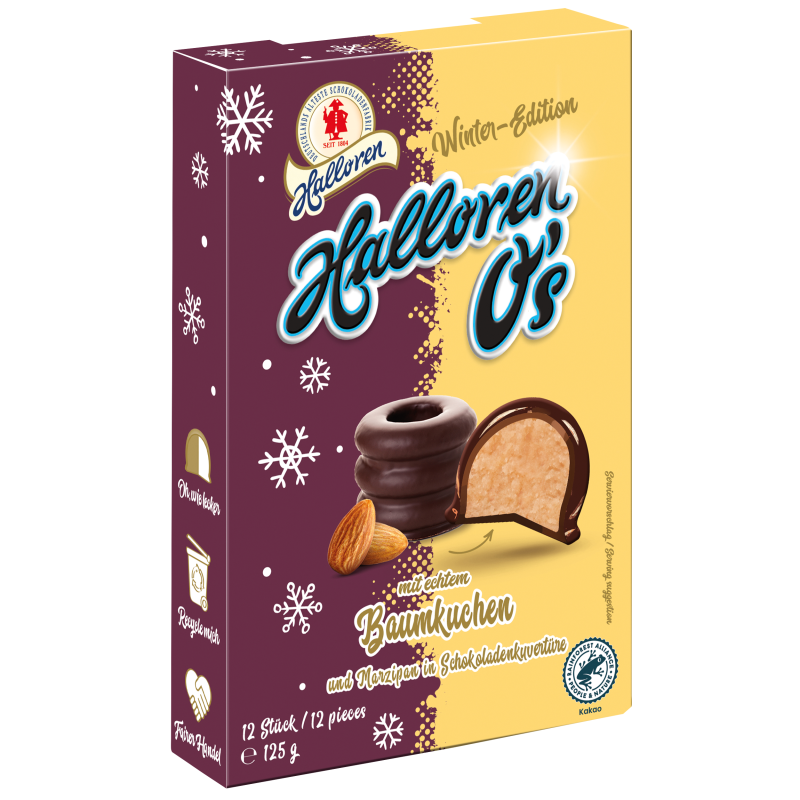 A Halloren O's Fatörzs sütemény a hagyományos Baumkuchen (fatörzs) tészta és az ikonikus Halloren Kugeln krémes töltelékének különleges találkozása. A réteges, puha sütemény finom csokoládéval bevonva telt, szaftos ízélményt ad, amelyben a klasszikus cukrászati jegyek és a Halloren egyedi karaktere tökéletes harmóniában jelennek meg. Ideális választás mindazok számára, akik szeretnék újra felfedezni a hagyományos édességek világát egy modern, prémium köntösben. Ajándéknak és vendégvárónak is kiváló.