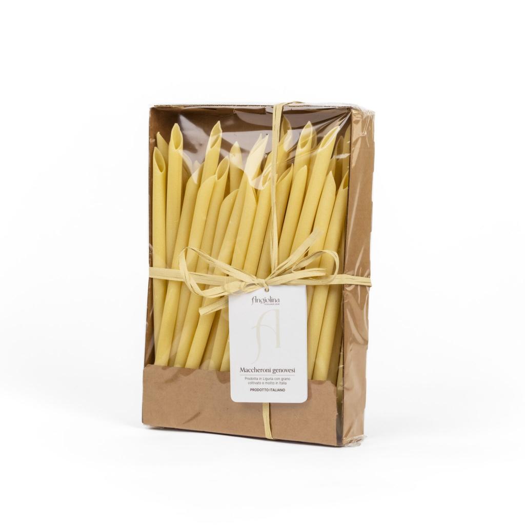 Angiolina Genovese makaróni – Hagyományos ligur tészta, hosszú, vékony és sima, tökéletes levesekhez és ünnepi fogásokhoz. Kézműves előállítás, 100% olasz búza és liguriai forrásvíz felhasználásával.