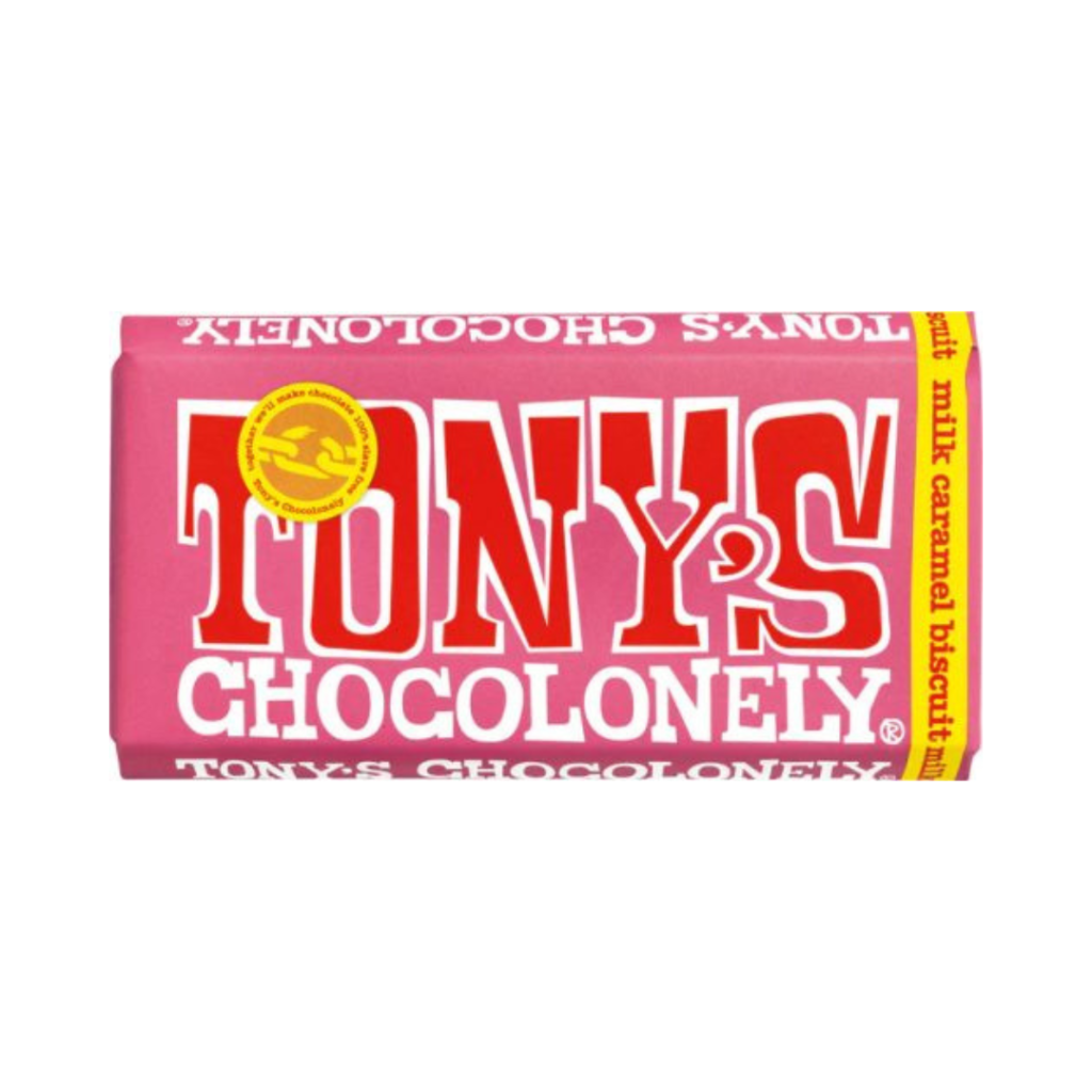 A Tony’s Milk Caramel Biscuit egy krémes tejcsokoládé tábla ropogós kakaós kekszdarabokkal és nagy, húzós karamelldarabokkal – tökéletesen kiegyensúlyozott, édes és textúragazdag élmény.