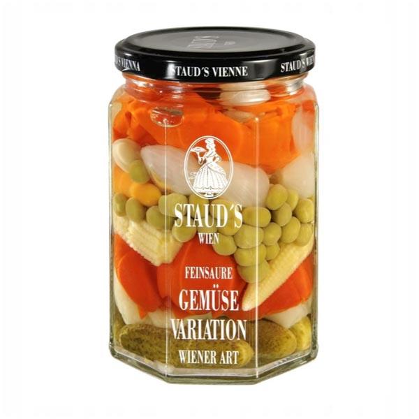 A Staud Savanyú zöldségvariáció egy válogatott, színes zöldségekből készült ínyencség, amely Ausztria egyik legelismertebb befőzőmestereinek kézműves terméke. A gondosan előkészített, enyhén savanykás zöldségek frissítő ízt és élénk színeket visznek a tányérra. A recept harmonikus fűszerezésének köszönhetően a zöldségek megőrzik természetes aromájukat, miközben finom, pikáns savanyúságot kínálnak.