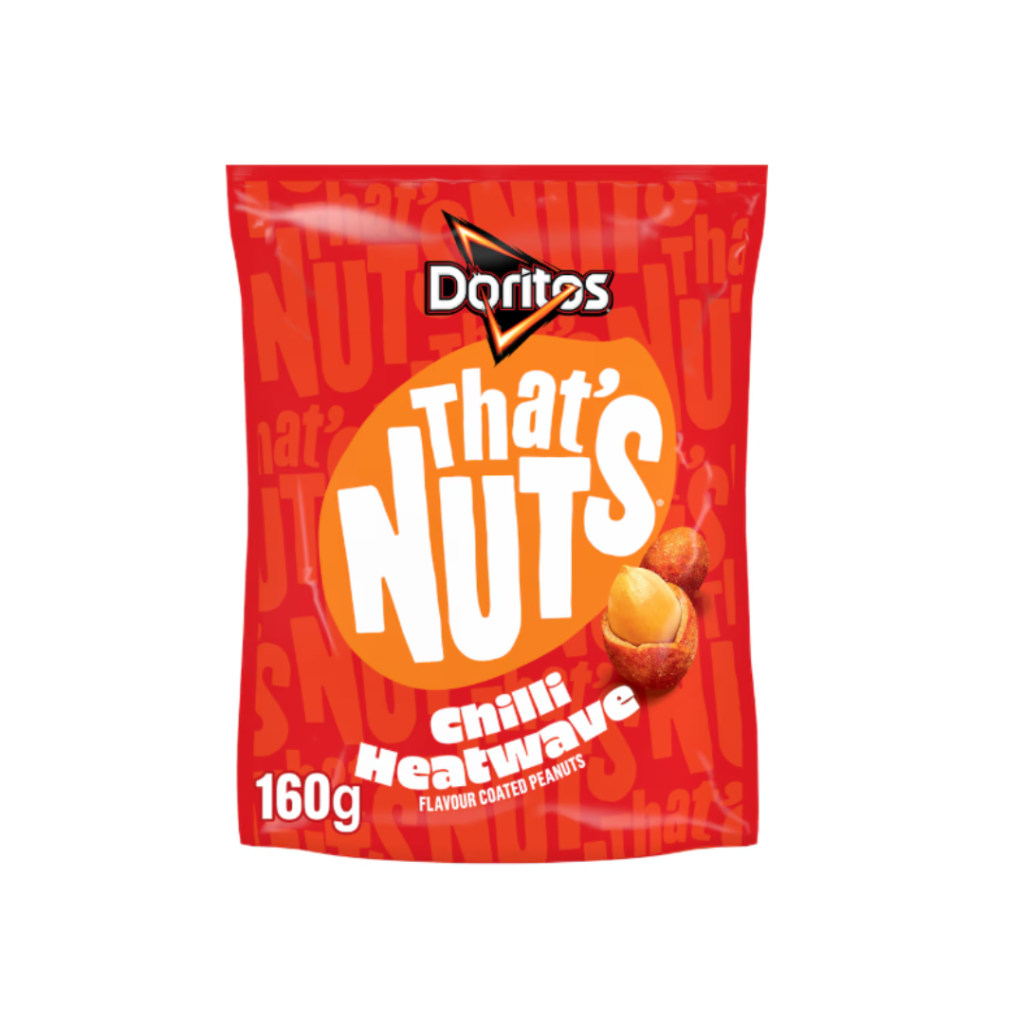 A Doritos That’s Nuts Chilli Heatwave egy izgalmas, csípős snack, amely prémium minőségű földimogyorót kínál ropogós, ízesített bevonattal. A Doritos Chilli Heatwave fűszerkeverék intenzív ízt ad minden falatnak, miközben a vegetáriánusok számára is ideális. Kényelmes megosztani barátokkal, vagy élvezni egyedül, és tökéletes választás minden snack kedvelő számára. A That’ Nuts termékkínálat további ízei, mint a Flamin’ Hot vagy a Walkers Salt & Vinegar bevonatú földimogyoró, még több élményt nyújtanak.